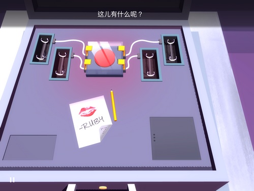 2、拨开两边的扣子打开箱子,拾取里面的黄色铅笔。调查纸张的右下角发现一个数字7的样式,这个线索会用在右边的墙壁。