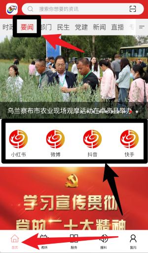 1、在首页的栏目中,你能够点击“要闻”等标签,进而浏览重点新闻内容。同时,在下方还设有跳转链接,可直接通往小红书、微博、抖音、快手等平台。