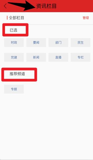 2. 轻点“资讯栏目”,即可进入栏目管理页面,在此页面能查看已选频道与推荐频道,并能自主调整需显示的内容分类。
