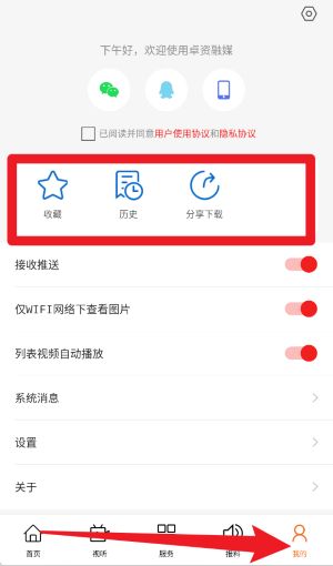 5、点开“我的”页面,就能查看收藏、历史以及分享等相关内容。此外,勾选用户协议与隐私协议,即可开启完整功能体验。