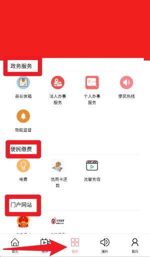 4、轻点底部的“服务”图标,就能使用政务服务、便民缴费以及门户网站入口,便于日常业务的查询与线上办理。