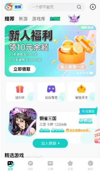 1、首页的新人福利板块,只要满足条件就能领取10元余额和0.1折游戏券,以此获取游戏资源