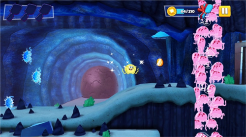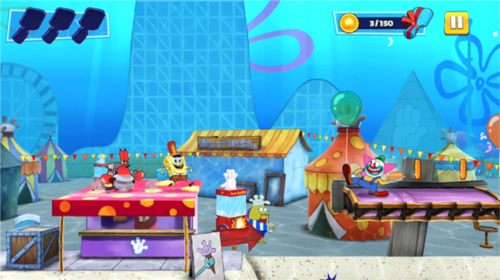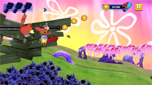 4、在每一个关卡的最后,玩家都必须和该场景的皮老板表兄弟来一场PK 赛!游戏过程中除了要躲避一系列障碍物以外,表兄弟们会在与海绵宝宝的追逐过程中投放爆炸物,玩家可以通过「冲刺」技巧来把这些爆炸物撞回给表兄弟们。当表兄弟们下方血条归零时,挑战就成功了!