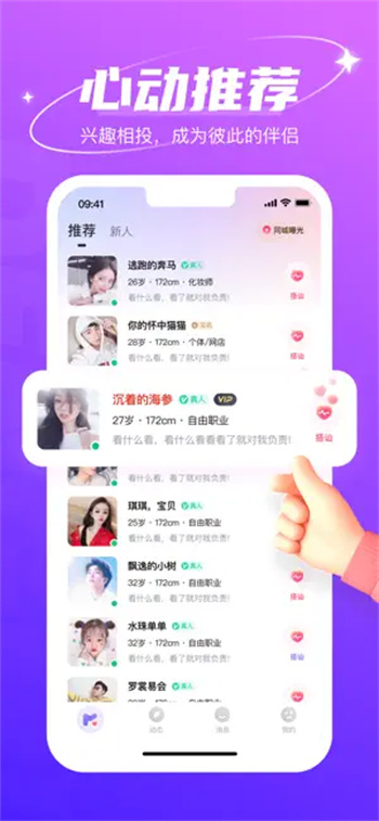 1系统依据用户的性格、兴趣和爱好等多个方面进行智能化推荐,帮助用户找到志趣相投的朋友进行互动聊天和交友,最终成为彼此的伴侣,培养深厚的情感。