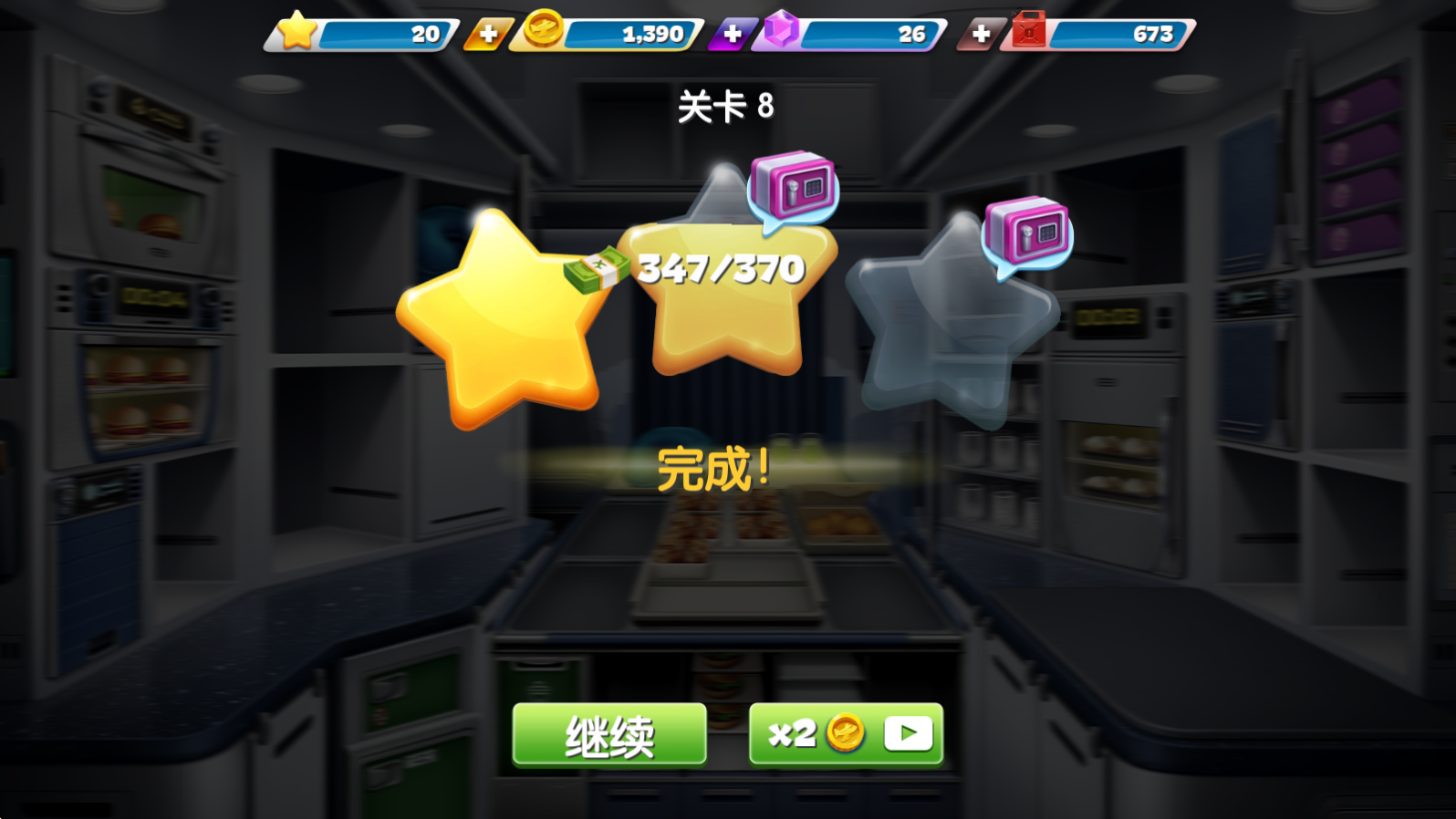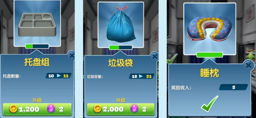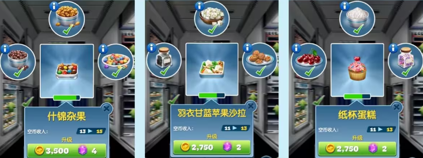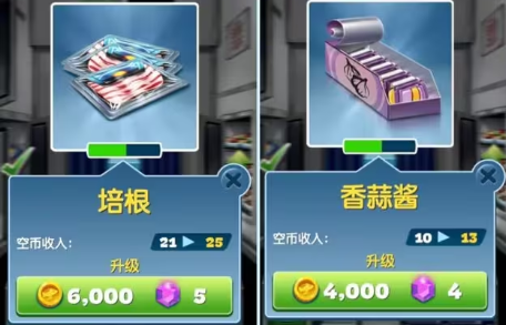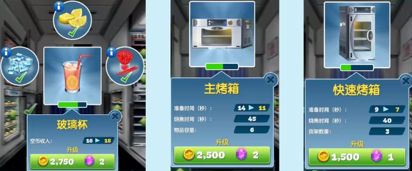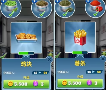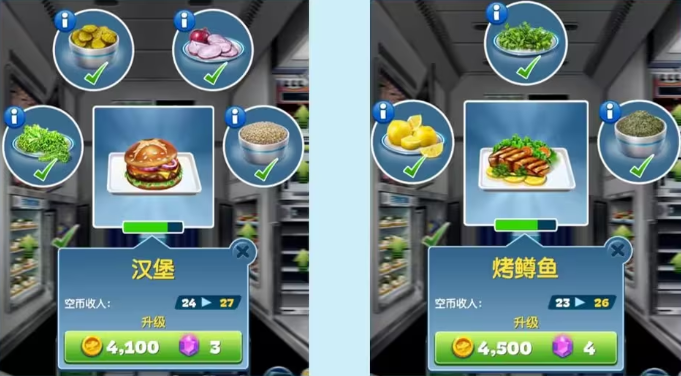 4、菜品和餐具的升级思路:食材升级优先金币升级,菜品重要性,汉堡、烤鳟鱼>纸杯蛋糕、什锦杂果、羽衣甘蓝>鸡块、薯条>柠檬水(杯子)、培根、香蒜酱。