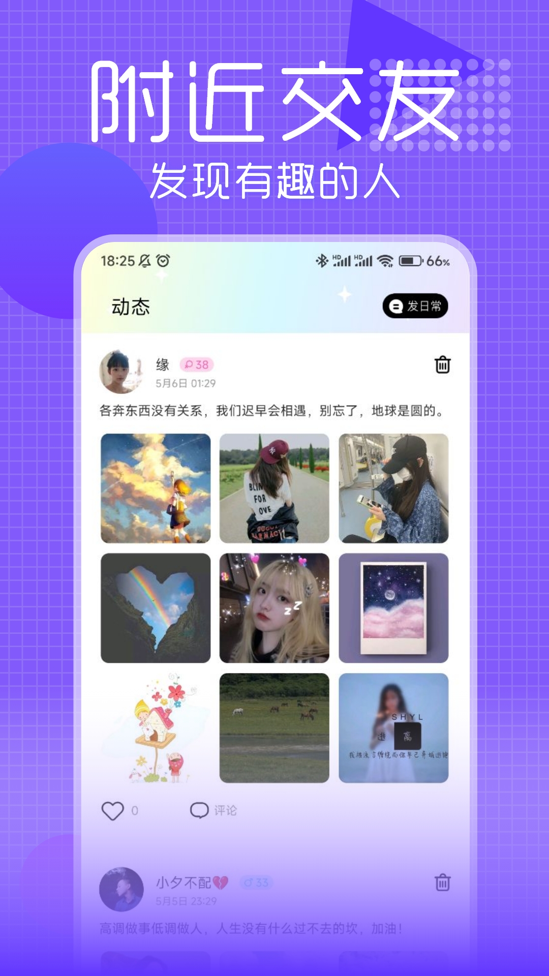 在主界面点击“附近的人”选项,应用基于手机定位功能,展示附近正在使用该应用的用户列表。列表中每个用户显示头像、昵称、年龄、距离以及简要兴趣标签等信息。用户通过滑动屏幕浏览不同用户,点击感兴趣的用户头像,可查看其详细资料,包括兴趣爱好、个性签名等。若想与对方打招呼,点击“打招呼”按钮,在弹出的输入框中输入问候语,发送消息开启交流。