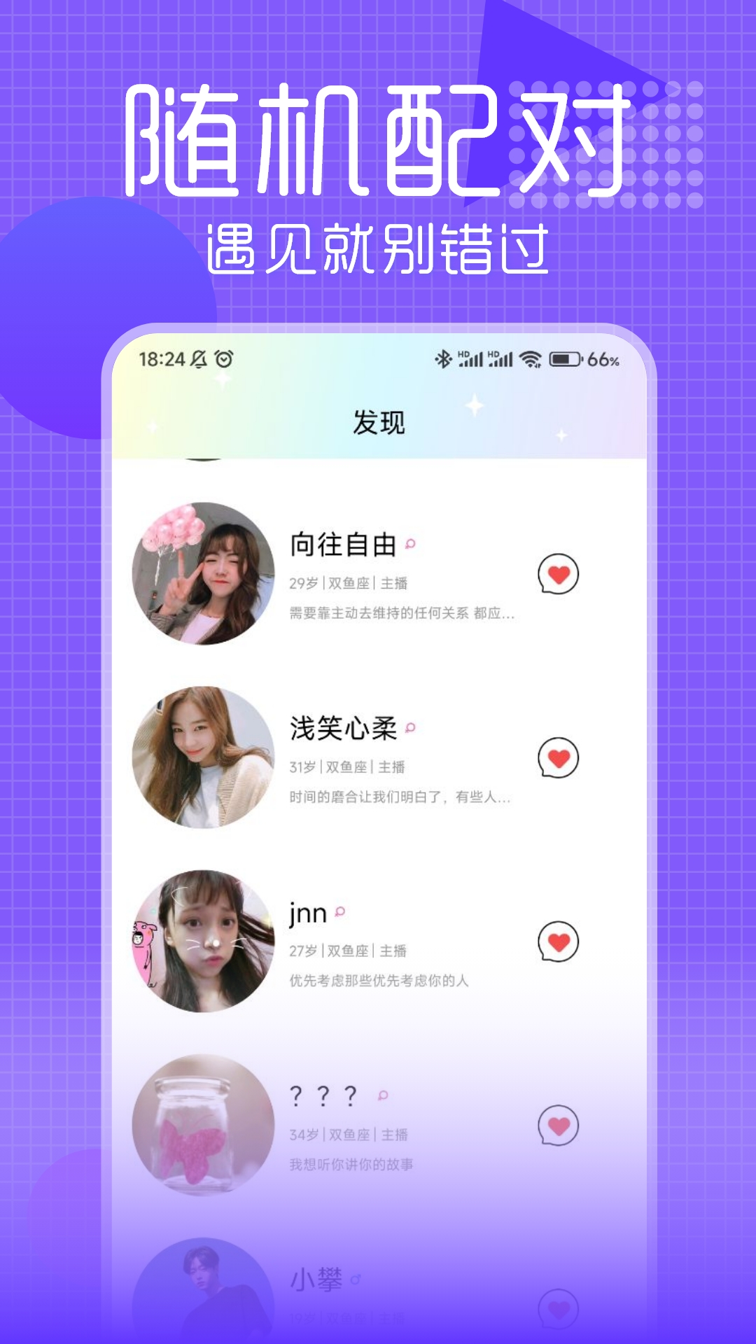 界面设计清新浪漫,以柔和色调搭配可爱元素,营造温馨氛围。布局简洁合理,操作按钮一目了然,从资料浏览、匹配好友到聊天互动,流程便捷,带来愉悦视觉与操作体验。