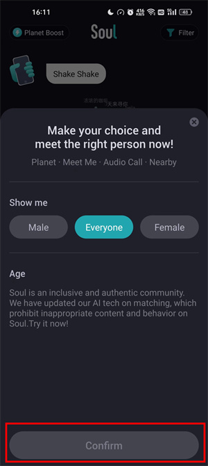 5、确认设置后返回大厅,点击meet me开始匹配,成功后即可开启聊天。