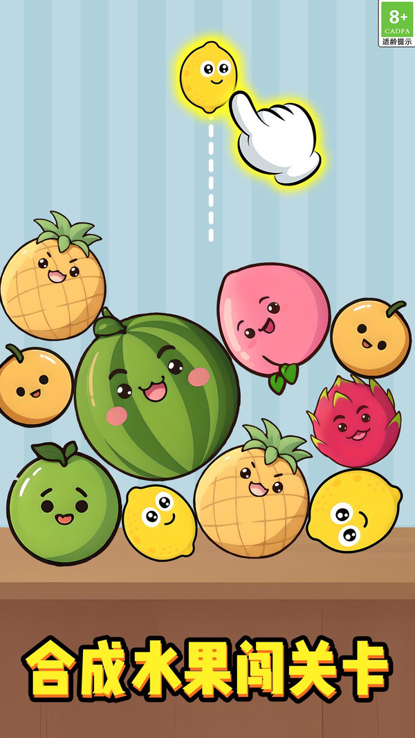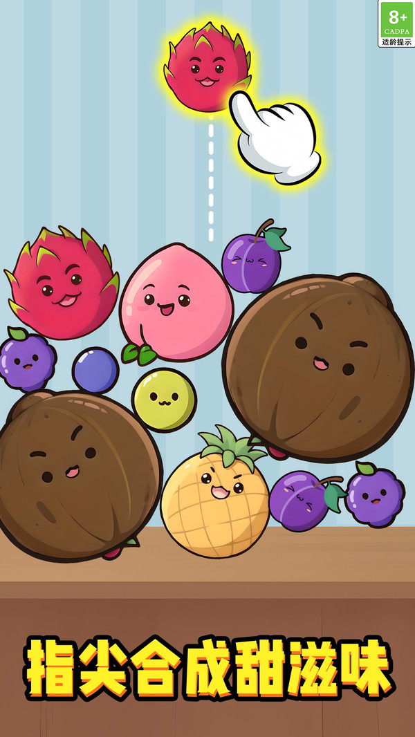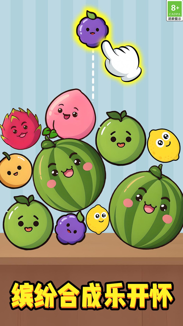 这是一款以合成水果为主题的休闲益智小游戏,只需点击,可爱的水果就会掉落,相同种类的水果相互合成就能实现升级,从小小的蓝莓开始,一路合成直至巨型水果,在充满趣味的合成过程中,收获无尽快乐。
