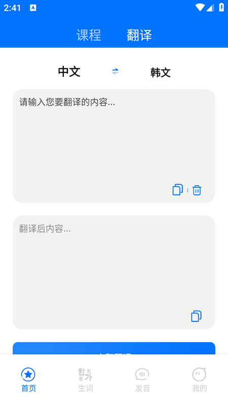 3、在首页的翻译页面,在输入框中输入需要翻译的中文或韩文内容,点击“立即翻译”按钮。可以查看翻译结果,点击“复制”可保存译文,点击“试听”可聆听发音。