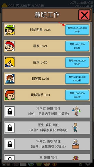 3、这次点击兼职工作,进入页面,点击蓝色按钮,升级他们,上一份工作升级到10等级后就会解锁 下一个工作。
