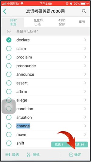 2.在书籍列表中选择目标词汇书,进入单词页后勾选任意单词,点击“确定”完成操作。