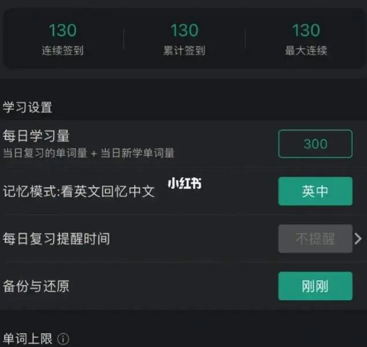 坚持每天学习,当连续达到一百天时,每天可额外获得6个单词上限。
