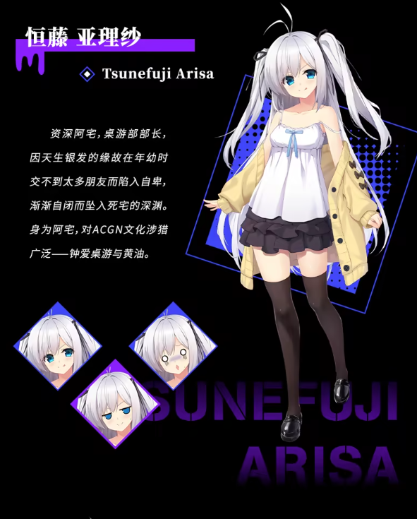 资深阿宅,桌游部部长,因天生银发的缘故在年幼时交不到太多朋友而陷入自卑:渐渐自闭而坠入死宅的深渊。身为阿宅,对ACGN文化涉猎广泛--钟爱桌游与黄油。