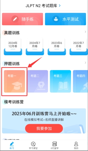 3、首页找到 “押题训练” 板块,点击 “考题一” 即可直接进入练习界面,开始答题。