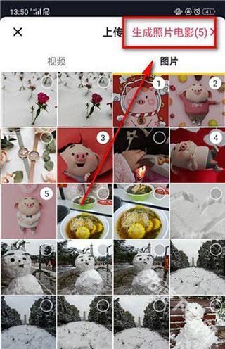 5、选择图片后点击右上方的【生成照片电影】;