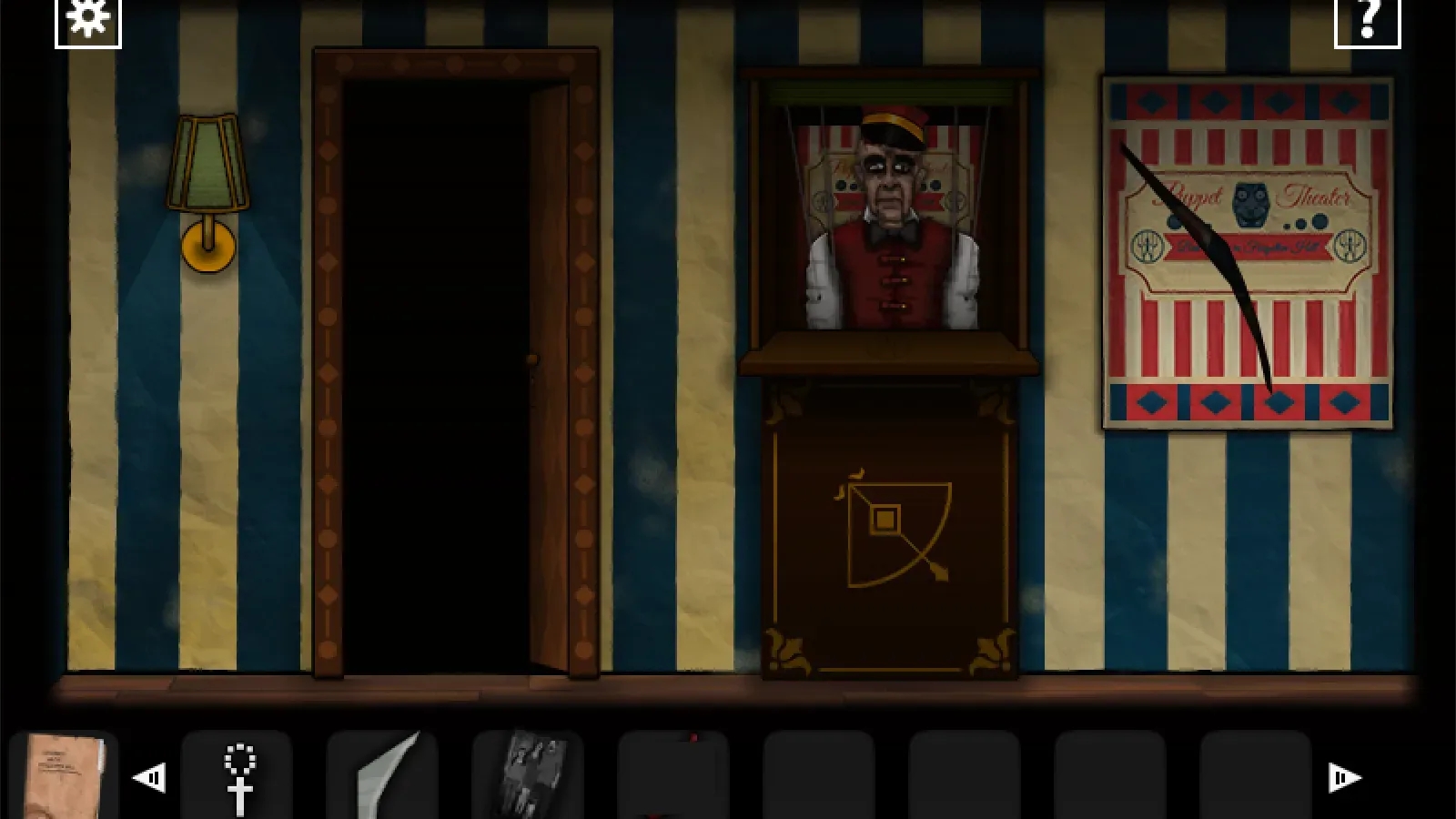 进入小丑头像房间拿走地上的蜡烛,根据红色书籍里的提示(月亮朝向)调整门上的笑脸即可,暂时缺少关键道具先不进去。