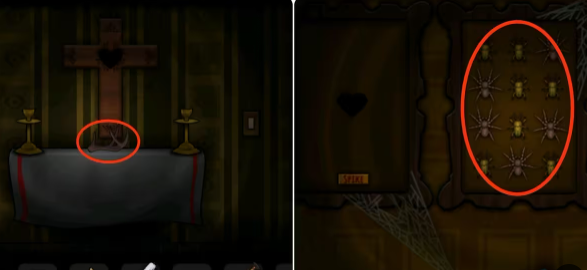 进入实验室根据旁边信封里的提示打开机器并放入鱼获得纸条,再到十字架处拿走桌布下方的银色十字架。