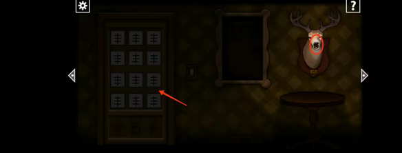 到走廊最右侧,先拿走桌上的鹿角并将其装在鹿头标本上获得戒指,再根据昆虫展示框里昆虫脚的数量打开标本左侧的机关门(实验室)。