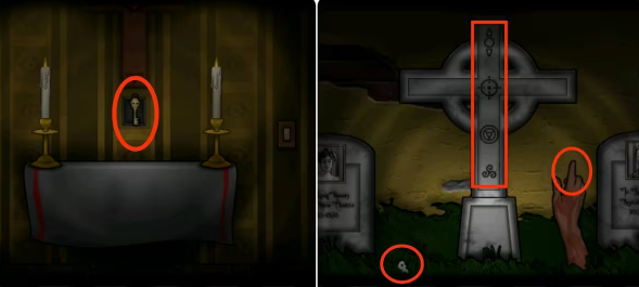 回到走廊最右侧将收集到的蜡烛和宝石放在烛台和十字架上,拿到钥匙后用其打开旁边的门进入后院完成两座墓碑上的拼图,接着拿走左侧出现的玩具钥匙,再将戒指戴在右边的手指获得第三张画像碎片。