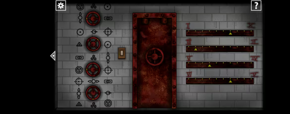 在墙上的手骨上有红色的指骨,根据指骨位置推算,需要按照顺序让①和②各往下四格,③和②各往上一格。完成后,会打开一个暗格,里面有一把钥匙。