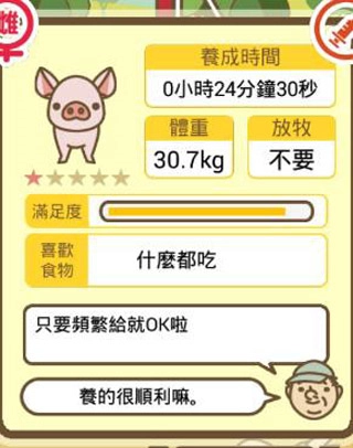 首先大家需要的是小猪购置的小猪都是猪仔,大家可以通过点击其身体,可以获得到以下信息: