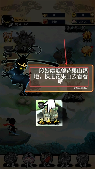 1、从花果山冒险启程,采用双虚拟按键来操控移动与技能,优先推进主线任务获取修为,以此快速解锁神通和装备系统。