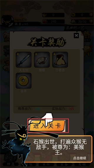 2、点击【进入关卡】挑战西游关卡,获取【大宝剑】-【僧帽】等装备奖励,提升战力推进冒险。