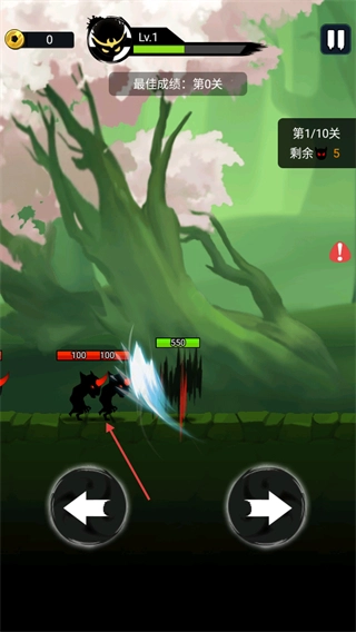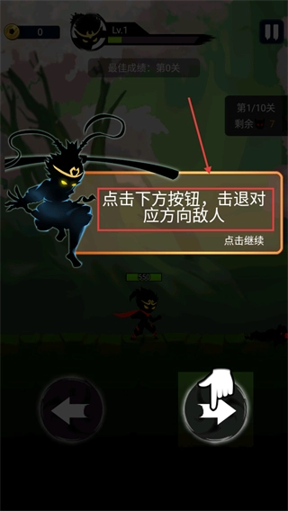 3、战斗时点击下方左右【方向按钮】,击退对应方向敌人,完成关卡提升角色等级与修为。