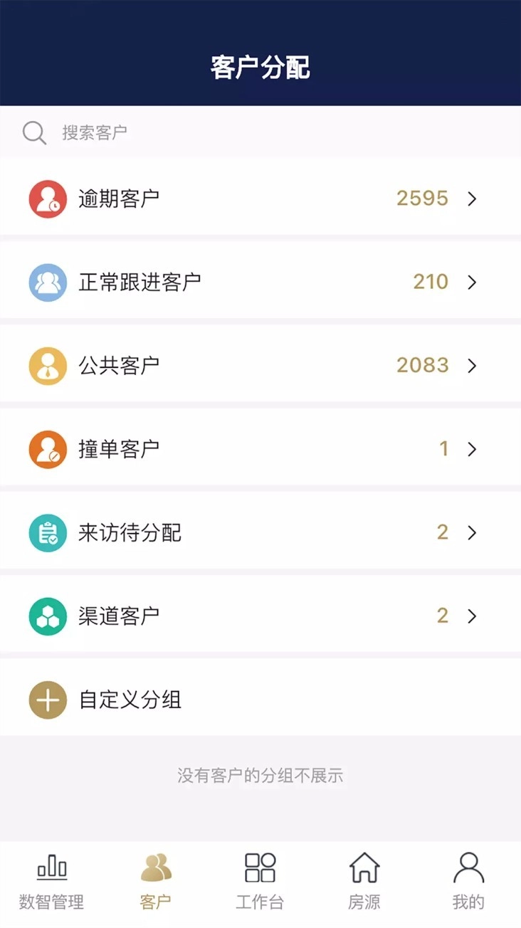 3. 点击底部菜单中的“客户”选项,进入客户管理页面后,能够查看客户分类与状态分组情况,并且可以对客户进行分配或跟进操作。