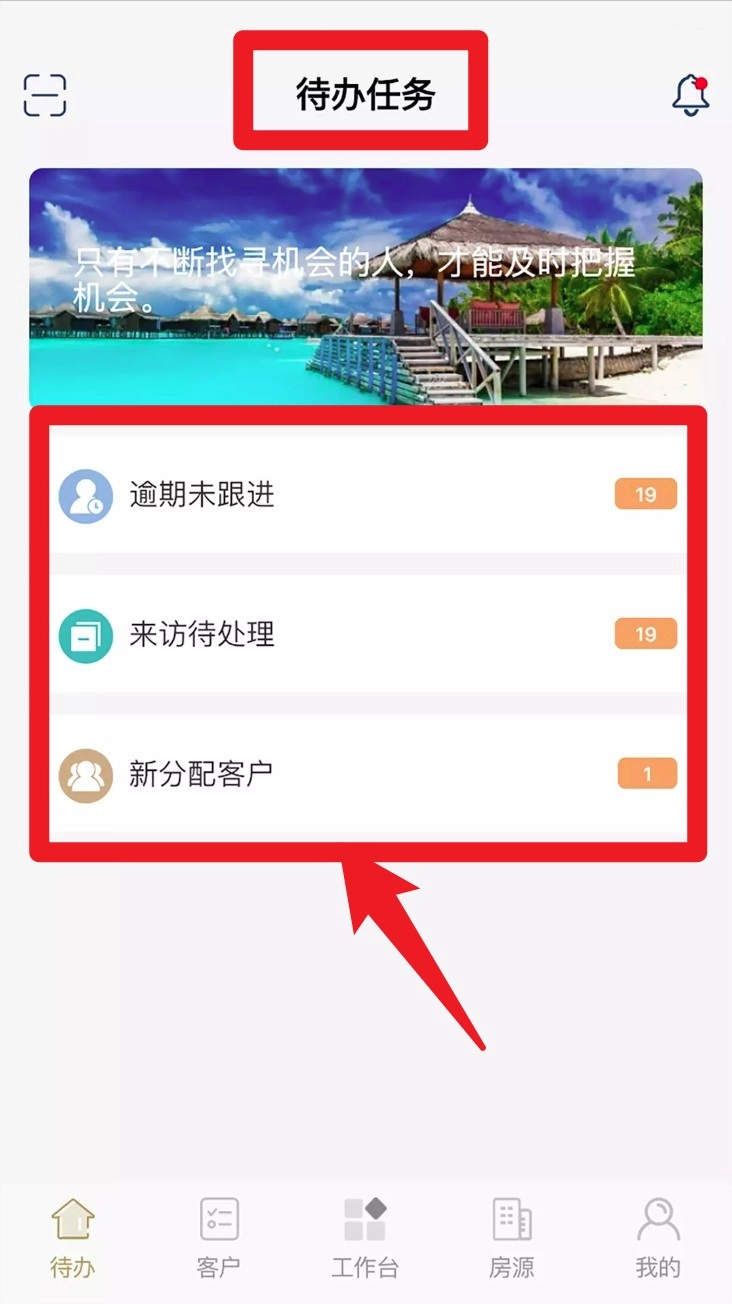4. 进入待办页面,查看逾期未跟进、来访待处理及新分配客户等各类待办任务,并及时处理以实现高效推进。