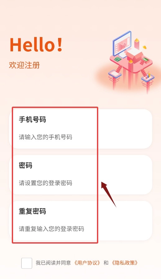 2、在注册页面填写手机号码并设置登录密码,确认后完成账号注册。