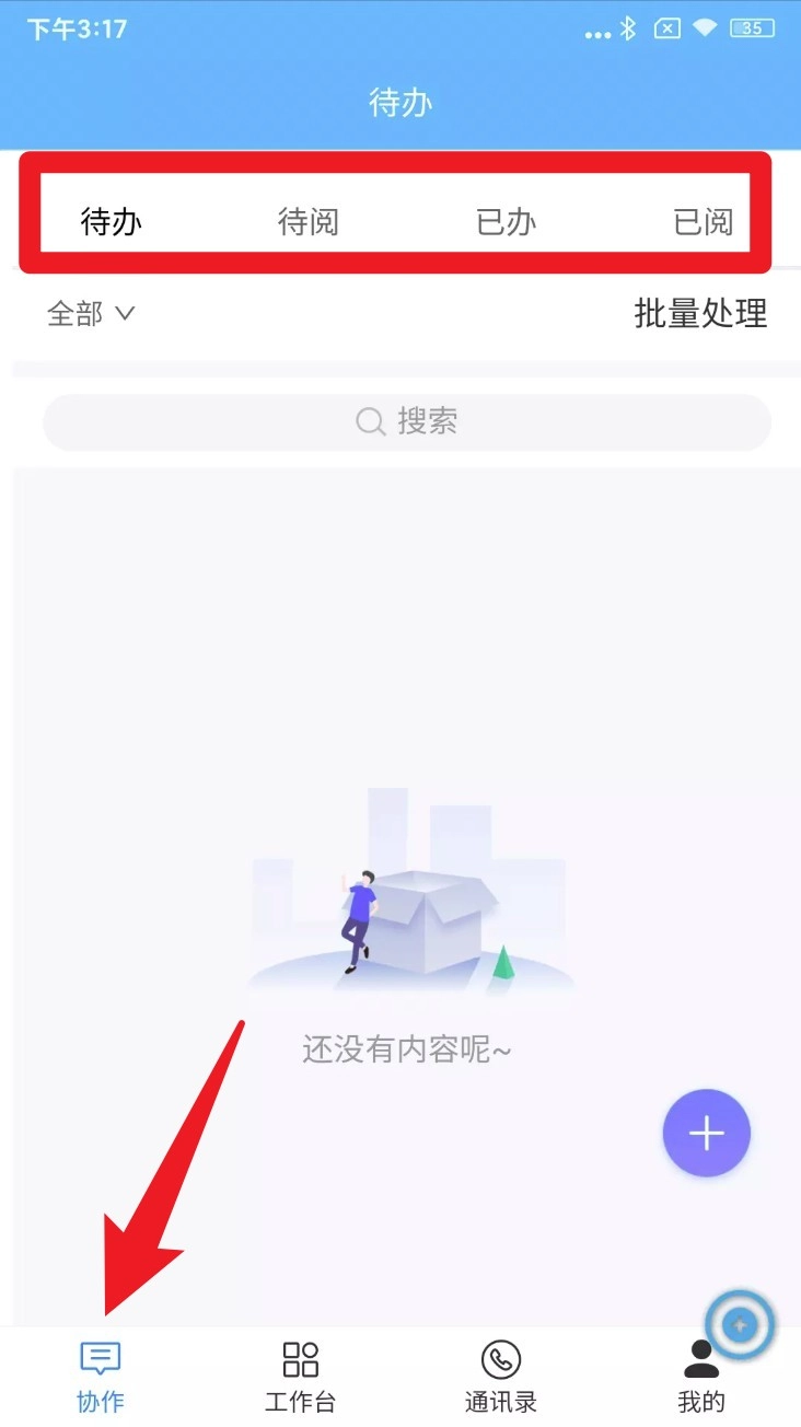 1. 点击底部菜单栏的“协作”选项,即可查看待办、待阅、已办等任务分类,以便快速了解各项任务的处理进度。