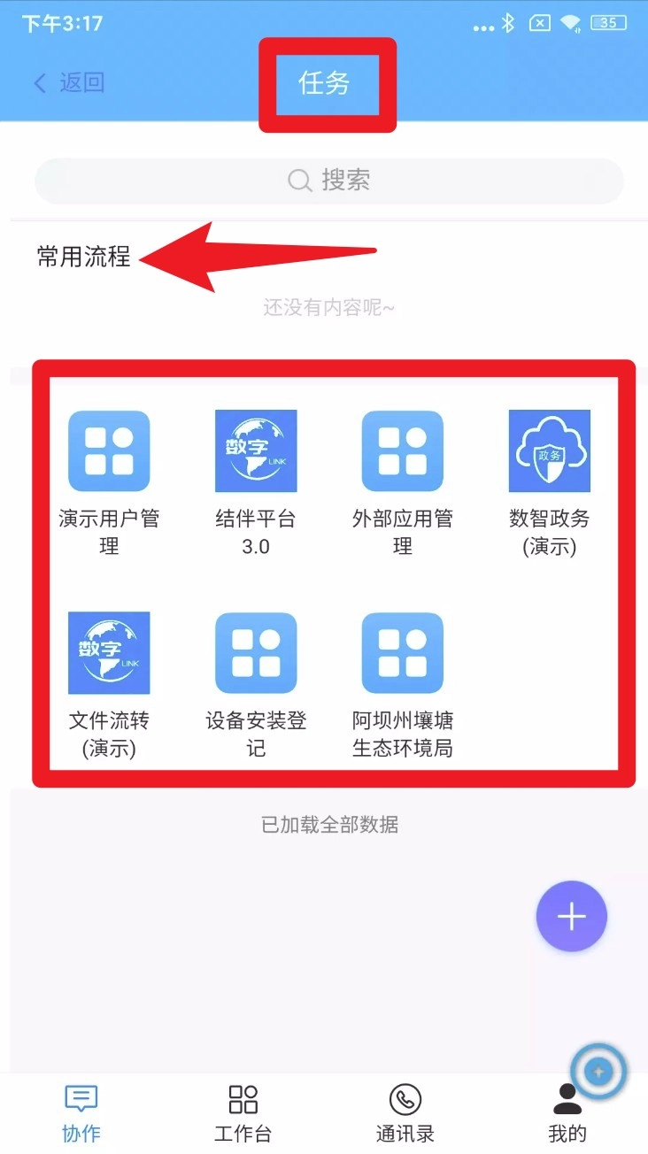 2. 点击页面右上角进入任务界面,从中选择常用流程模块,例如文件流转、人脸管理之类的功能选项。
