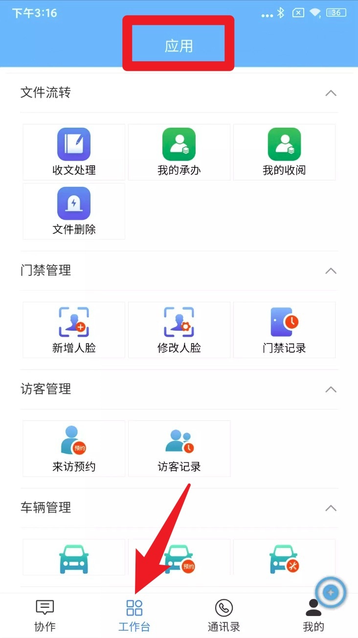 3. 进入工作台页面后,就能使用公文处理、门禁管理、访客预约、车辆申请等具体功能了。