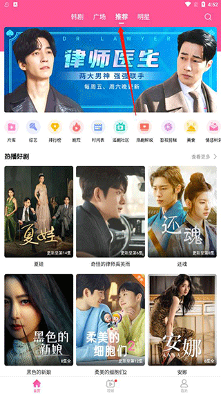 1、在韩站官方app首页中有四大版块,分别是韩剧、广场、推荐和明星,在韩剧中就可以发现时下热门好剧,精选热剧、青葱少年时等各种分类;
