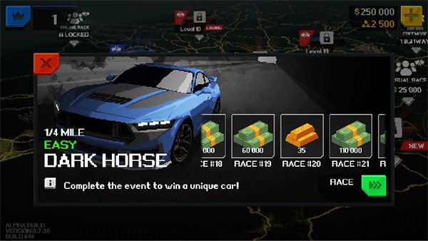 1、在游戏主页,可以选择给车辆改装,换色,购买新车等等,点击race即可开始赛车;