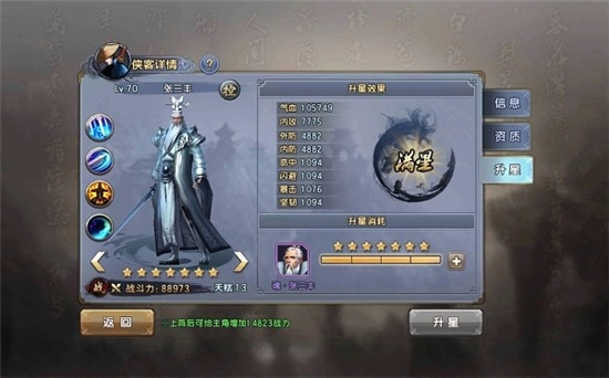 玩家在副本里能获取不少侠客装备,进入侠客界面就能把装备给侠客穿上。等侠客凑齐一整套装备,就能给侠客升阶了。升阶后的侠客,属性加成会更强。培养侠客得用资质丹,资质丹能从日常副本和抽奖里拿到。侠客吃了资质丹,自身属性会有很大提升。