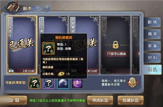 装备获取的方式主要为挑战副本(剧情副本、装备副本、组队副本),随着玩家等级的提升,副本等级逐步提高,同时掉落的装备属性也会增加