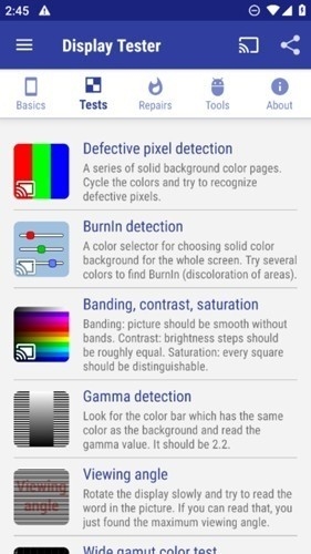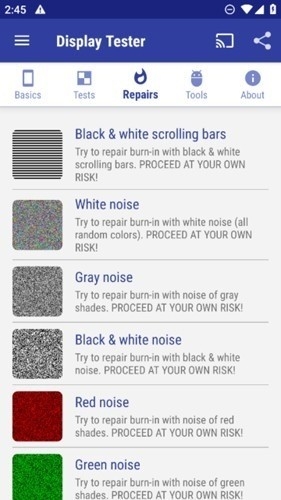 display tester是专门针对安卓手机开发的烧屏修复工具,它操作简便,能一键检测手机烧屏问题的成因并完成修复;同时运用先进技术,可对后续可能出现的类似情况提前做好防护,是一款相当实用的工具类软件。
