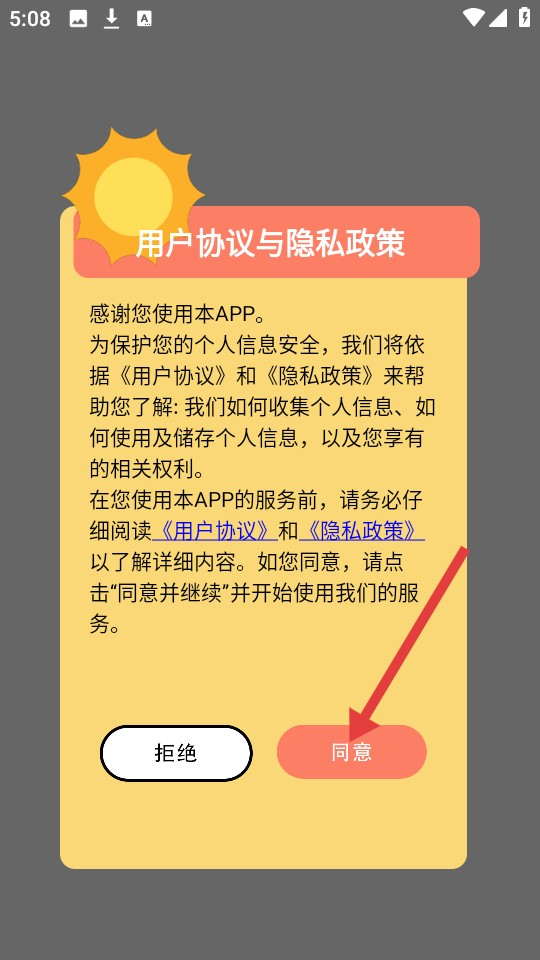 1、首次打开,在【用户协议与隐私政策】弹窗,点击【同意】,进入应用。