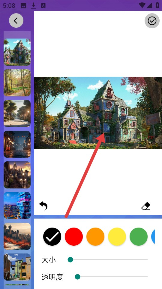 4、在创作页,选左侧素材、底部颜色/大小/透明度等参数,对画面进行涂鸦创作。