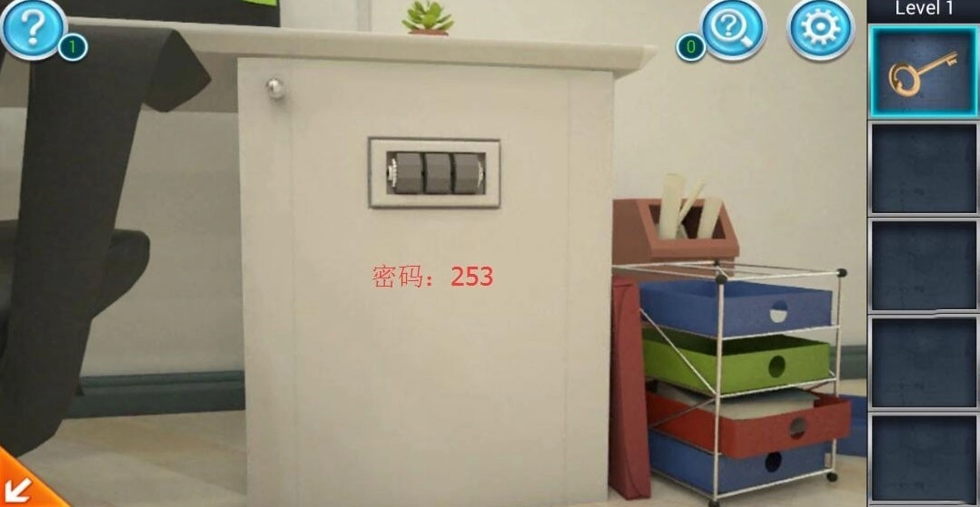 3、输入密码“253”开启写字桌下边的木柜,得到锤头。