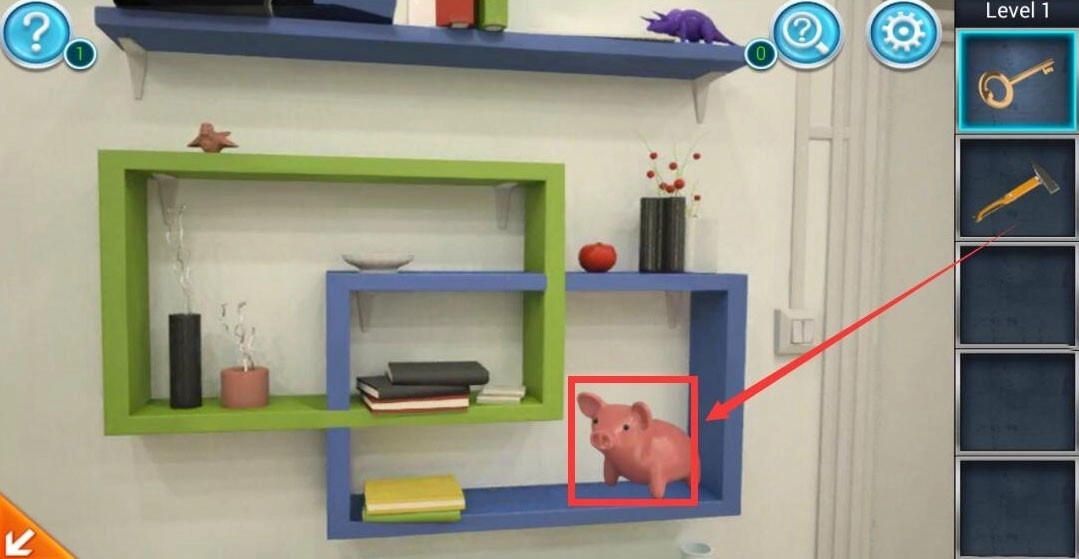 4、点击门的左侧架子,用锤子将小猪存钱罐摆脱,可得到钱币。