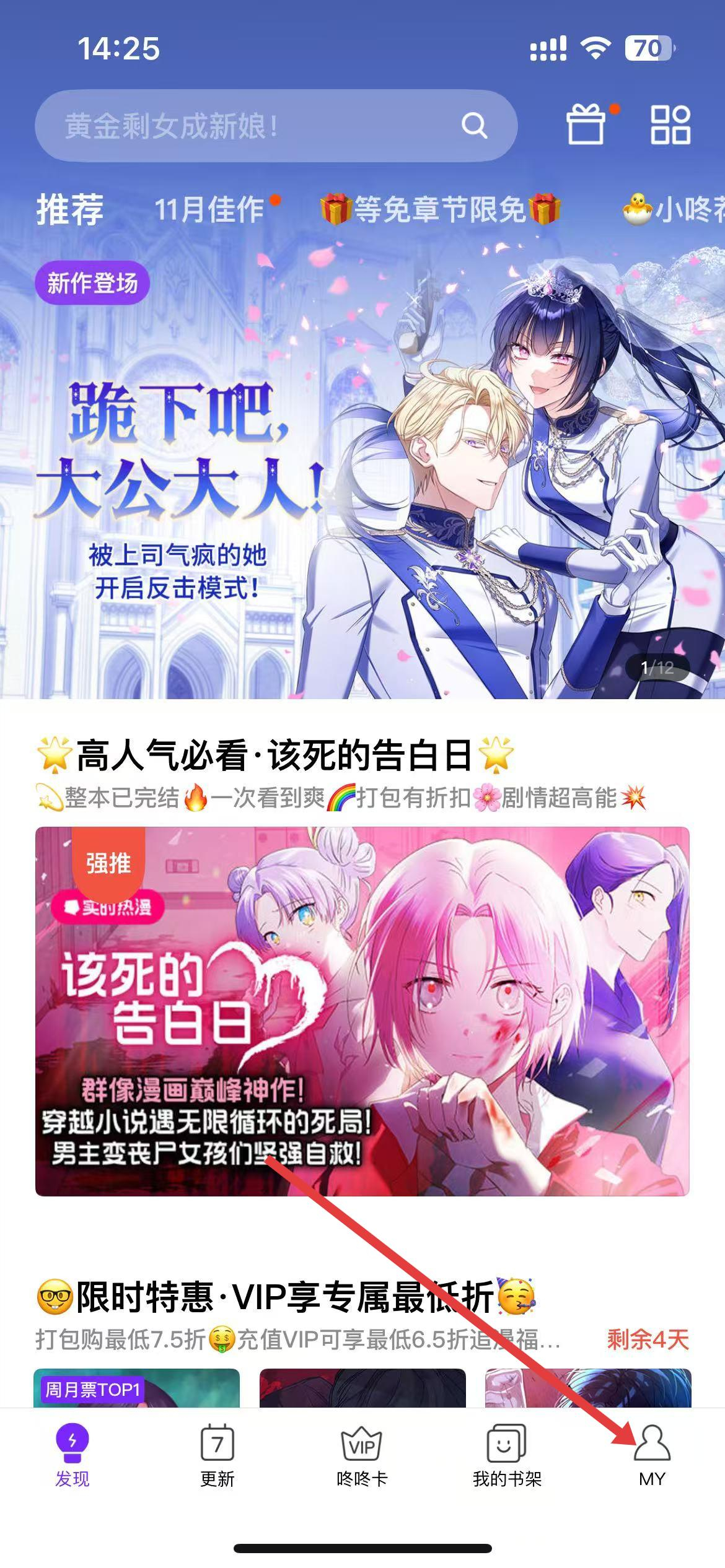 1、进入应用发现板块,可见推荐漫画如跪下吧,大公大人等,还有高人气必看漫画板块,点击底部MY可进入个人界面。
