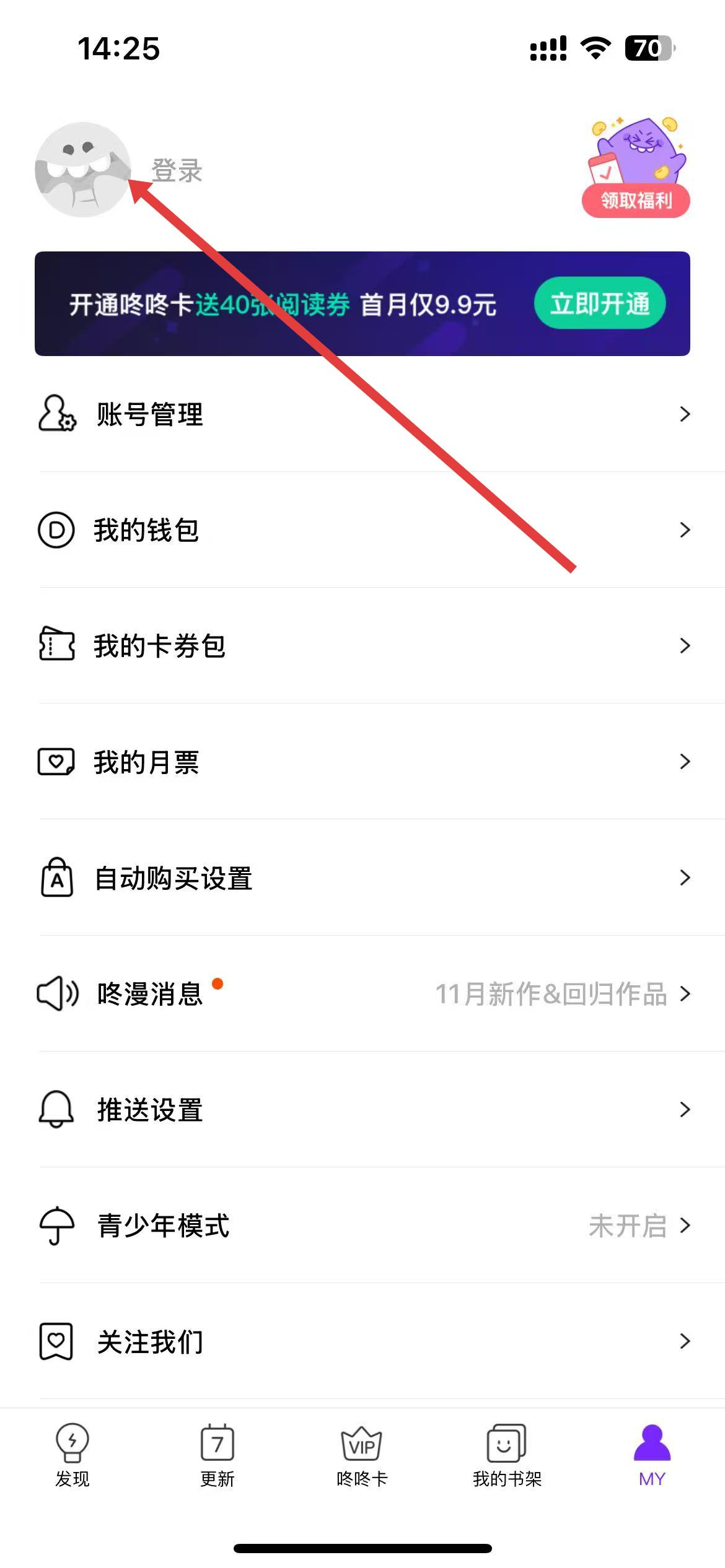 2、MY界面,可点击登录进入账号管理、我的钱包等功能入口,还能领取福利,管理个人漫画阅读相关设置。