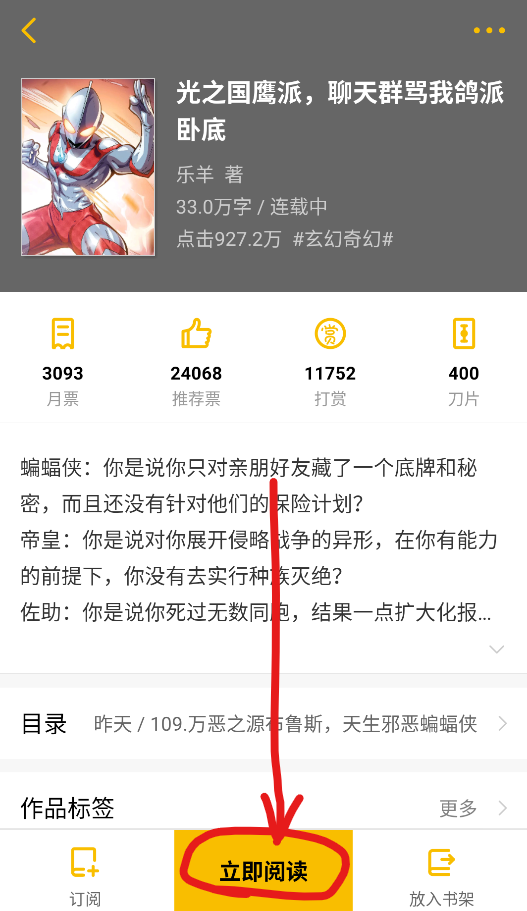 1、打开想下载的小说,进入详情界面,然后点击中间最下方的立即阅读