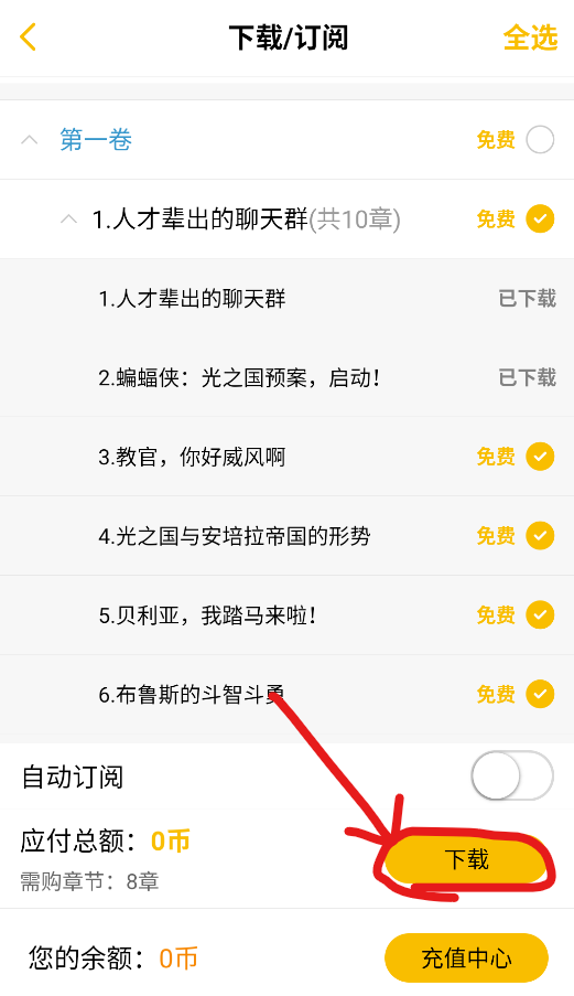 3、选择自己要下载的章节,然后点击右下角的下载(付费章节需要购买之后才能下载),下载完成后即可离线阅读
