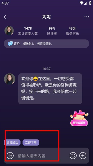 4、在聊天页面,可通过输入框发送内容,向妮妮进行咨询。