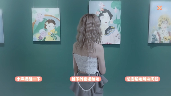 先来看第一章,首次与郑梓妍相遇是在一个画廊,玩家注意到她的裙子破了,之后需要选择自己的行为,这里选第二个“脱外套递给她”即可加好感。